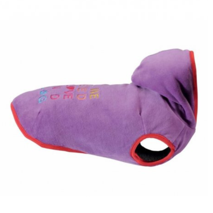 Il cappuccio può essere fissato al dorso tramite un pratico bottone, offrendo versatilità e protezione aggiuntiva contro il freddo. L'interno del maglioncino è rivestito in pile rosso, garantendo ulteriore comfort e calore al vostro fedele compagno.