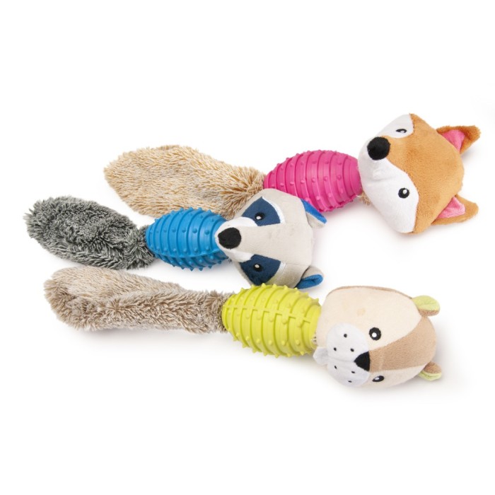 Divertenti e colorati giochi in peluche con pallina in TPR, squeaker interno e scratch.