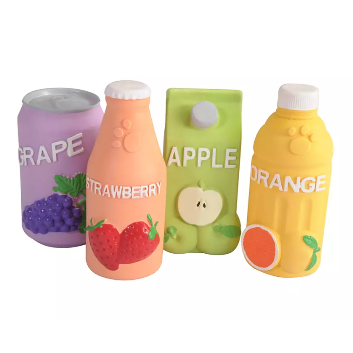 gioco latex c/ovatta e squeaker a forma di mix fruit juice.