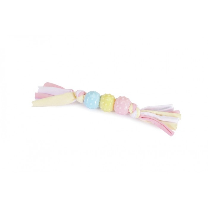 Resistente e divertente gioco composto da tre palline in tpr e da un tessuto annodato alle estremità.