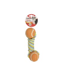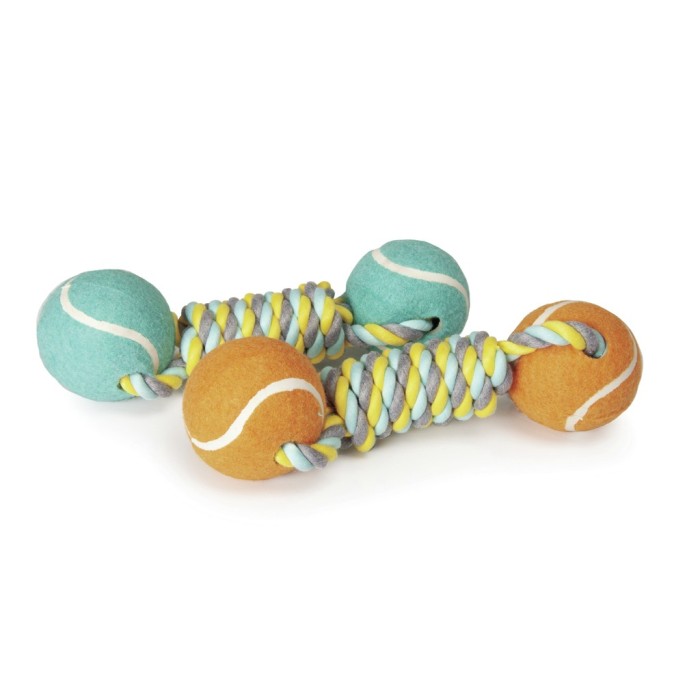Divertenti e colorati giochi per cani costituiti da due palline da tennis e dal cotonosso centrale.