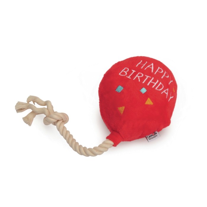 Palloncino "Happy Birthday" in poliestere con inserto in corda e squeaker.