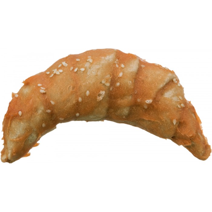 Croissant Denta Fun al pollo, realizzato con pelle di bovino ricoperta di pollo. Disponibile in articoli sfusi, ma venduto solo in confezioni complete.