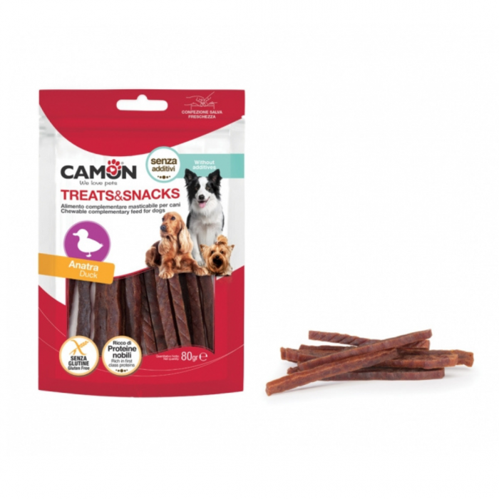 Dettagli del prodotto: Treats Snack all’anatra Duck Strips AE515, confezione da 80g, marca Camon. Questi sono alimenti complementari masticabili per cani adulti, ideali per integrare la dieta quotidiana con un gustoso premio.
