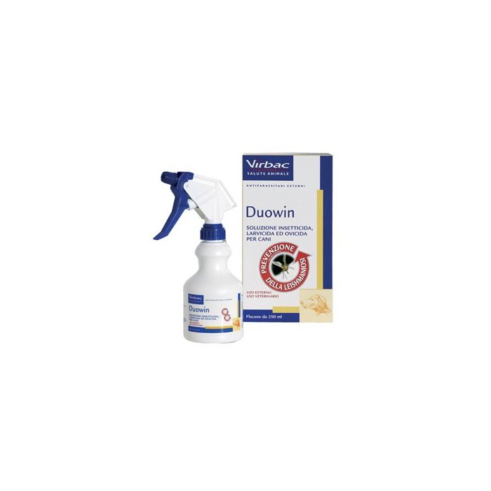 DUOWIN è una soluzione antiparassitaria a base permetrina e piriproxifene contro la puntura dei flebotomi agenti di trasmissione della leishmaniosi e contro pulci e zecche.