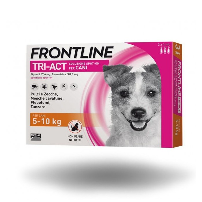 Frontline Tri-Act è un antiparassitario spot-on per cani da 5 a 10 kg insetticida ed acaricida. La soluzione in comode pipette da 1 ml ognuna contiene due principi attivi: Fipronil e Permetrina che permette di proteggere il vostro cane da zecche e pulci ed inoltre è un repellente ed elimina zanzare, pappataci e mosche cavalline.