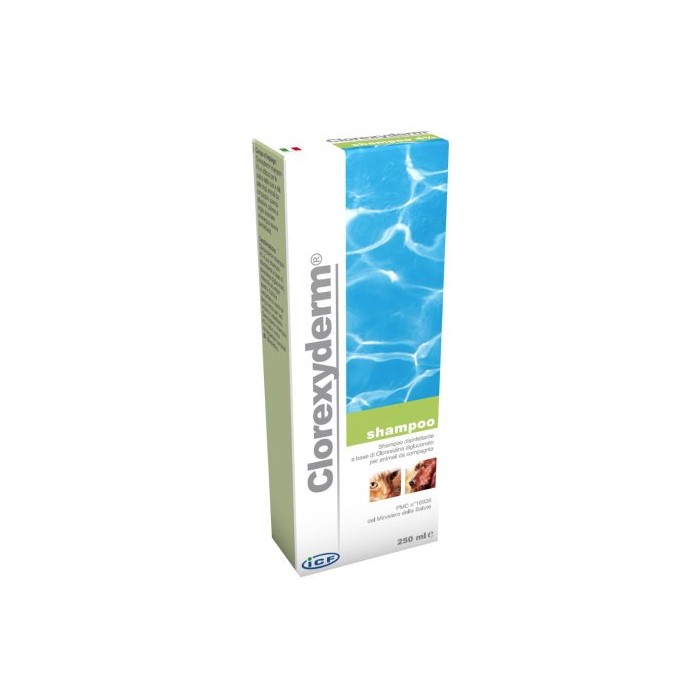 ICF clorexyderm shampoo 250 ml è uno shampoo disinfettante alla clorexidina per la pulizia e l’igiene di cani e gatti.
