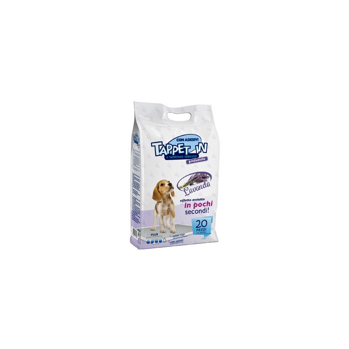 TAPPET-IN Tappet In è un tappetino multistrato di alta qualità profumato alla Lavanda, ultra-assorbente e anti-odore, in grado di risolvere il problema igienico causato dai cuccioli addestrati in casa. Il primo strato, realizzato a griglia, permette la diffusione omogenea del liquido, è filtrante e garantisce un effetto asciutto immediato. Il secondo strato, grazie alla realizzazione in cellulosa e in speciali polimeri super-assorbenti, assicura un’efficace azione assorbente e allo stesso tempo antibatterica, riducendo la proliferazione di batteri e l’insorgenza di cattivi odori. In questo strato i liquidi vengono assorbiti e trattenuti definitivamente. Infine l'ultimo strato, impermeabile, mantiene la superficie sottostante perfettamente asciutta. Gli speciali strip adesivi consentono di mantenere il tappeto sempre in posizione, mentre i 4 cm di bordo evitano fuoriuscite e facilitano la dismissione del prodotto. Ideale in casa come in viaggio, Tappet In può essere utilizzato anche come fondo per cucce e trasportini. Tappet in è un prodotto di qualità superiore, realizzato con assorbente contenente uno speciale polimero 3G SAP proveniente dal Giappone. La capacità di assorbimento di tappet-in è fino a tre volte superiore ad altri prodotti analoghi.