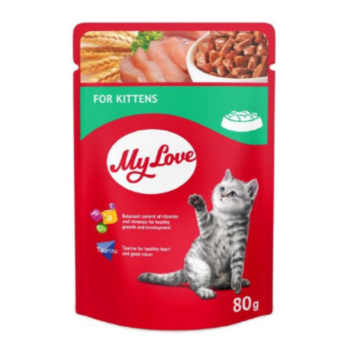 Cibo umido per gatti cuccioli bocconcini con morbida salsa di pollo.