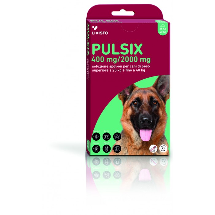 Pulsix 25/40 Kg è un antiparassitario in pipette per cani, efficace contro un ampio spettro di parassiti esterni. Pulsix offre una protezione completa e prolungata contro pulci, zecche, pidocchi masticatori, pappataci, zanzare e mosche cavalline. Questo antiparassitario, grazie alle sue proprietà, rende migliore la qualità di vita del tuo cane.